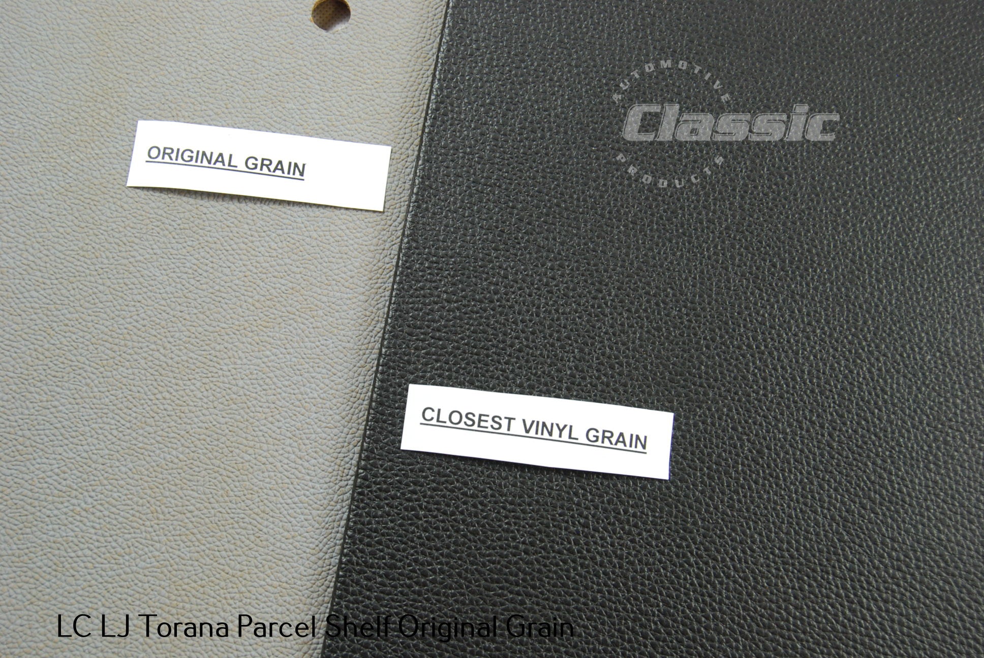 Made from masonite (not kick panel cardboard like others) and vinyl covered in the closest vinyl you will get to the original grain. See photo for comparison of the original grain parcel shelf and the vinyl we have sourced.