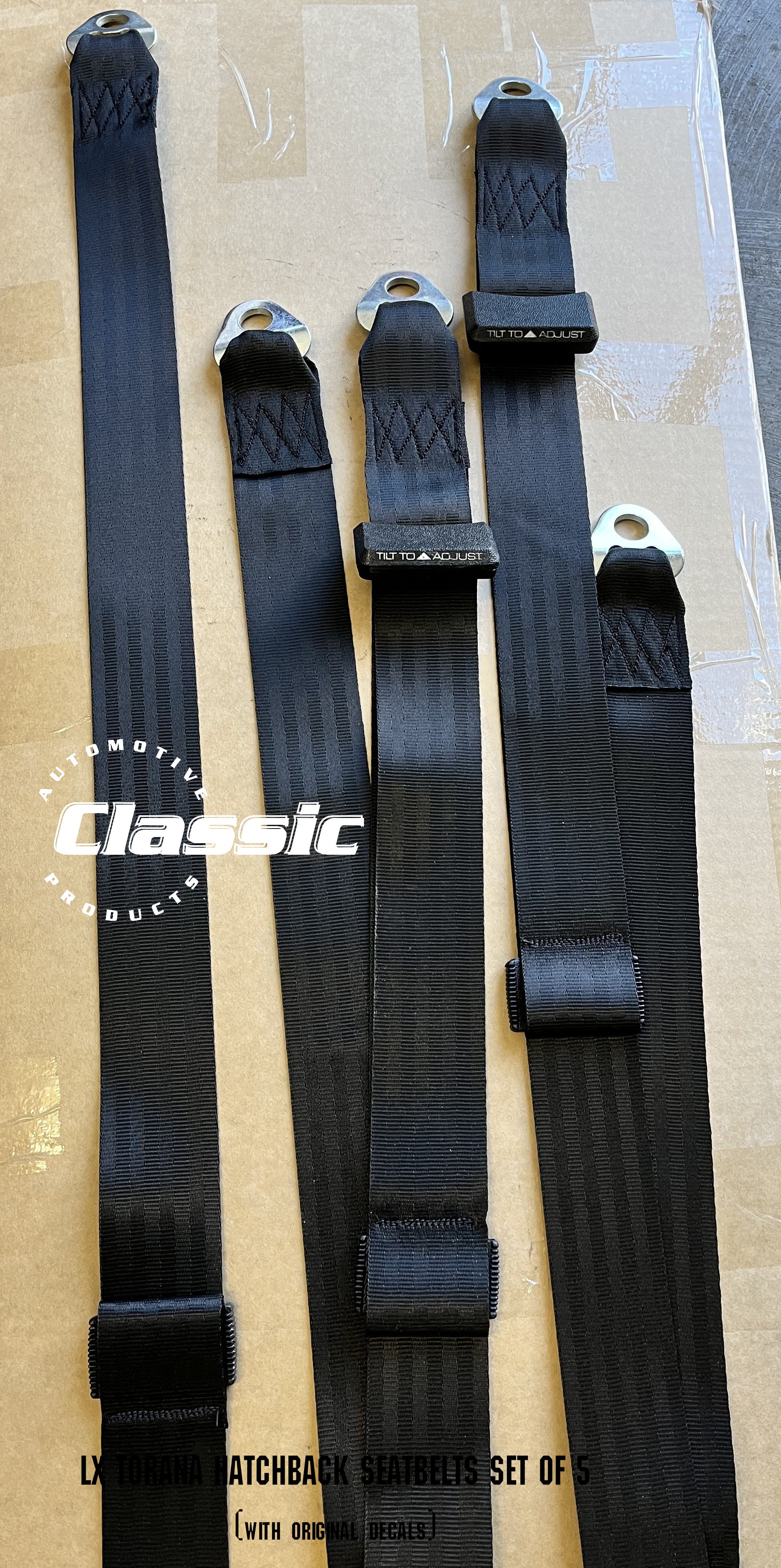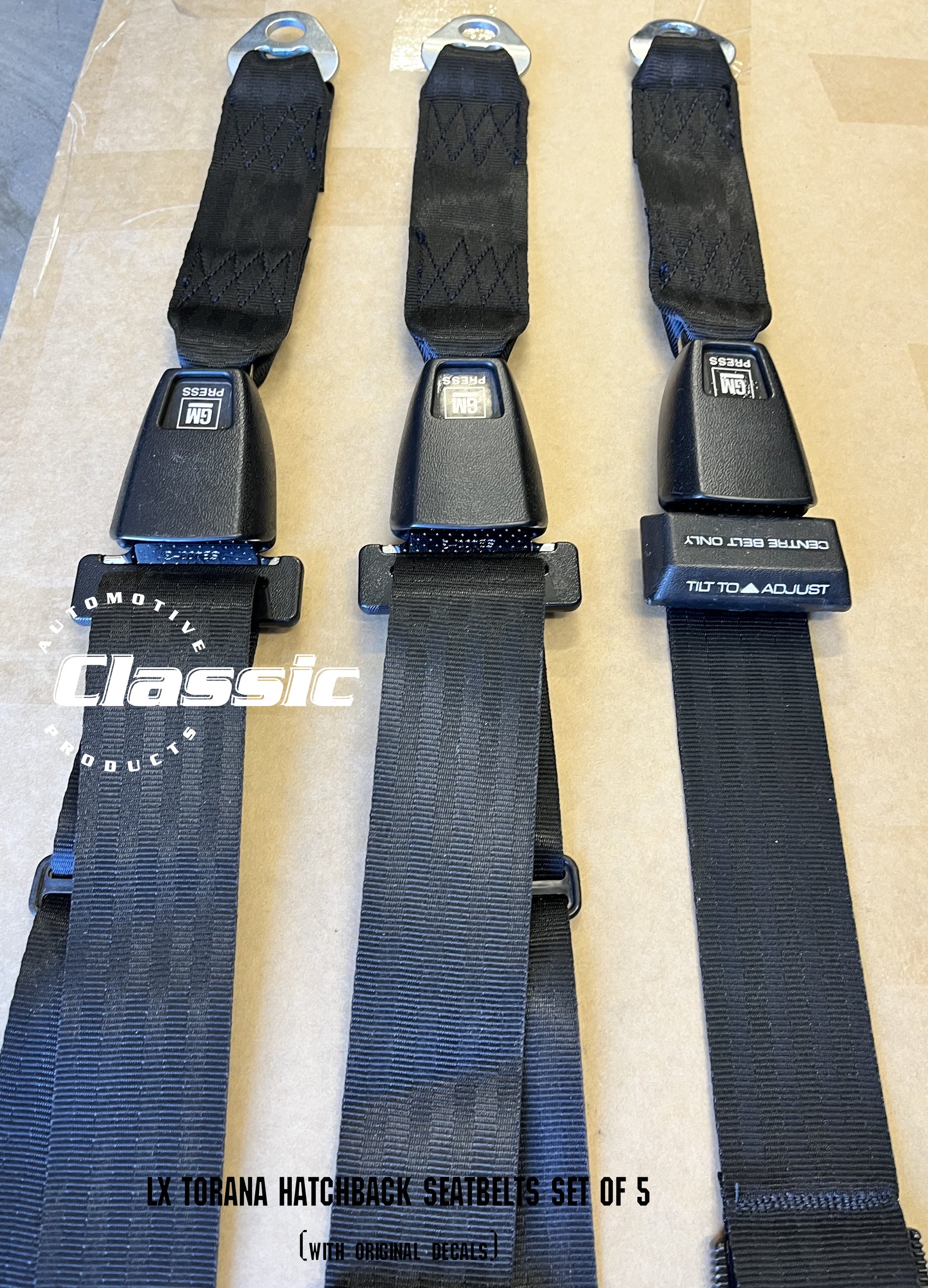 Fully reconditioned set of 5 seatbelts to suit LX Torana Hatchback (with original decals)